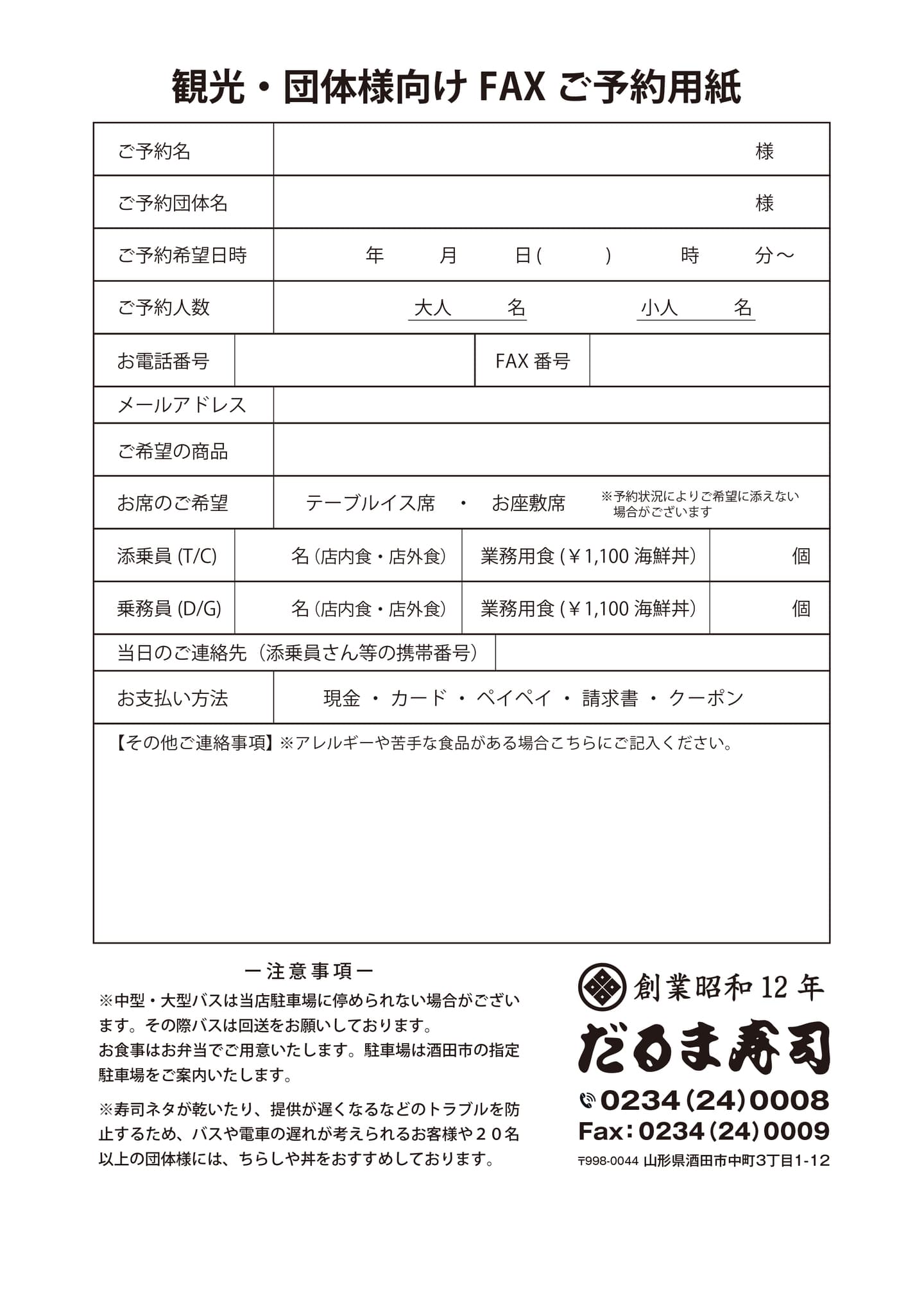団体様・観光会社様向けのFAXご予約用紙をご用意いたしました。