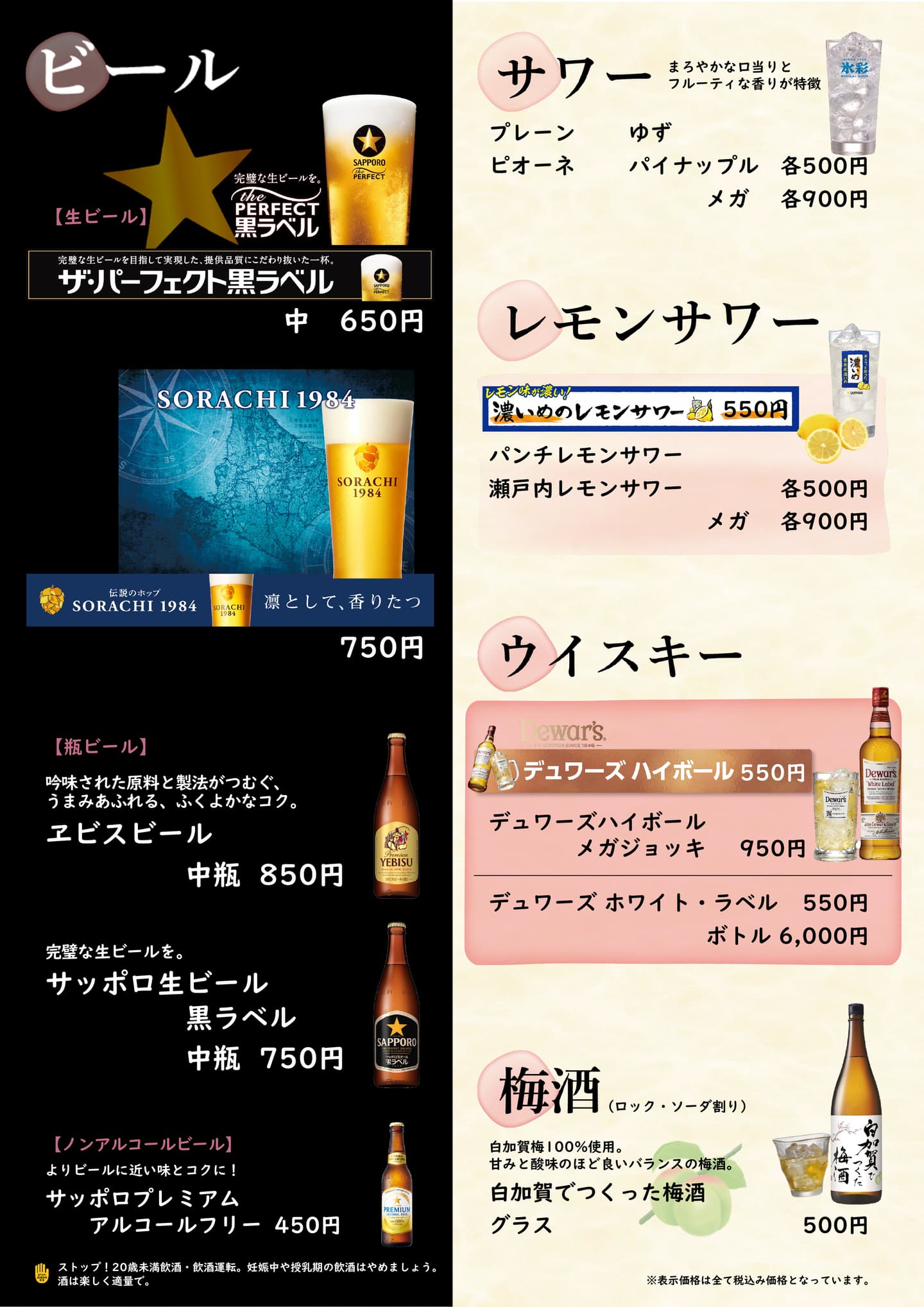 地酒をはじめ、パーフェクト黒ラベルやソラチビールなどいろいろ!