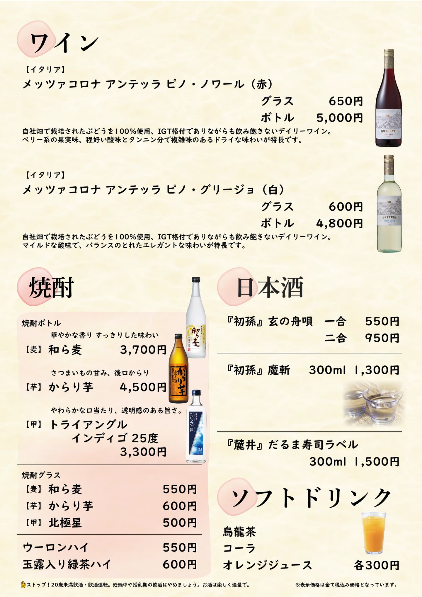 ※追加のお飲み物は、グラス又は瓶が空になってからお願いいたします。