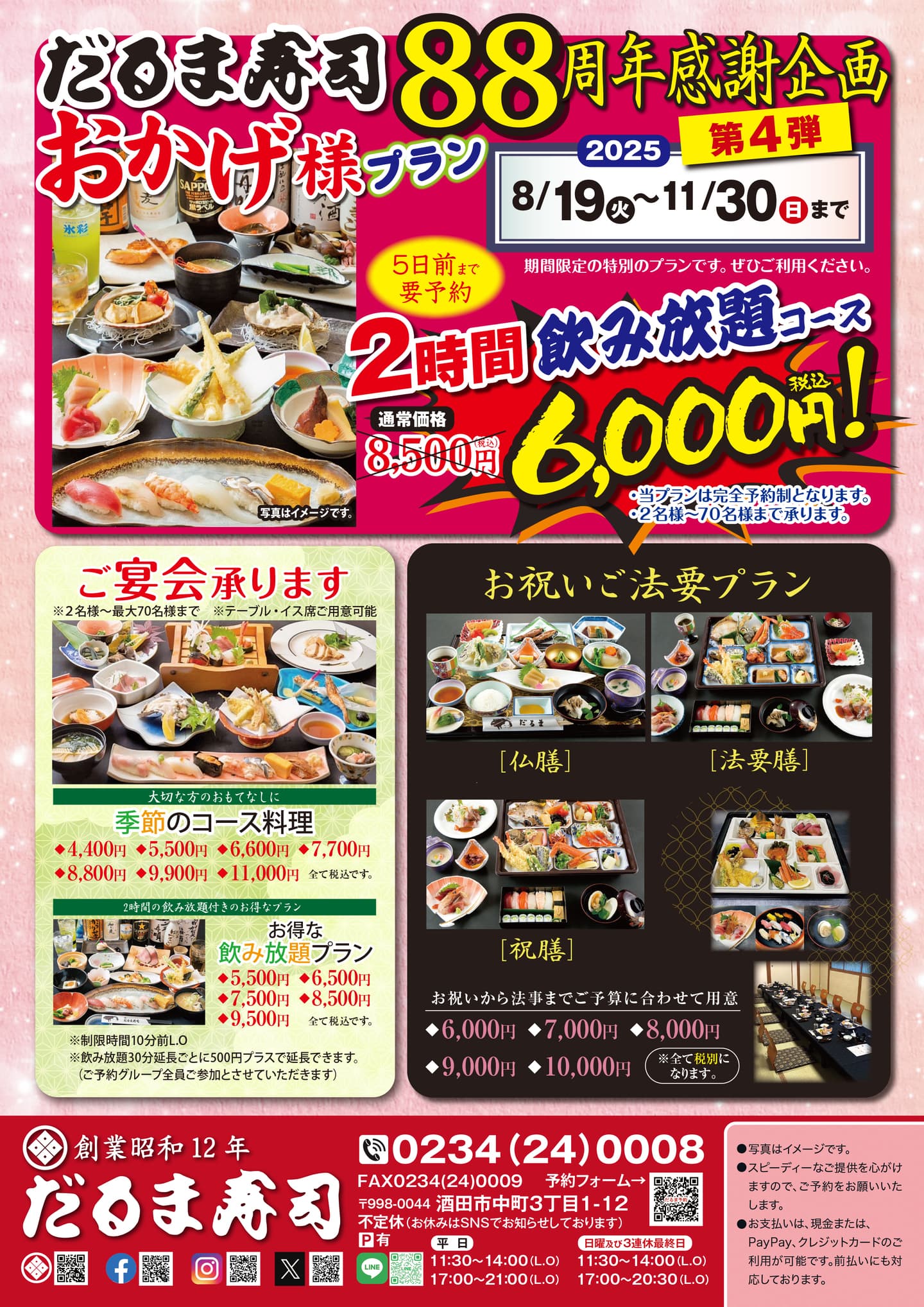 ,facebook,,{"facebookPageUrl":"https://www.facebook.com/darumasushi.sakata","boxHeight":"556","boxWidth":"100","dispFace":false,"dispUpdate":true,"dispHeader":true,"wUnit":"%","hUnit":"px"} TOP | 感謝企画